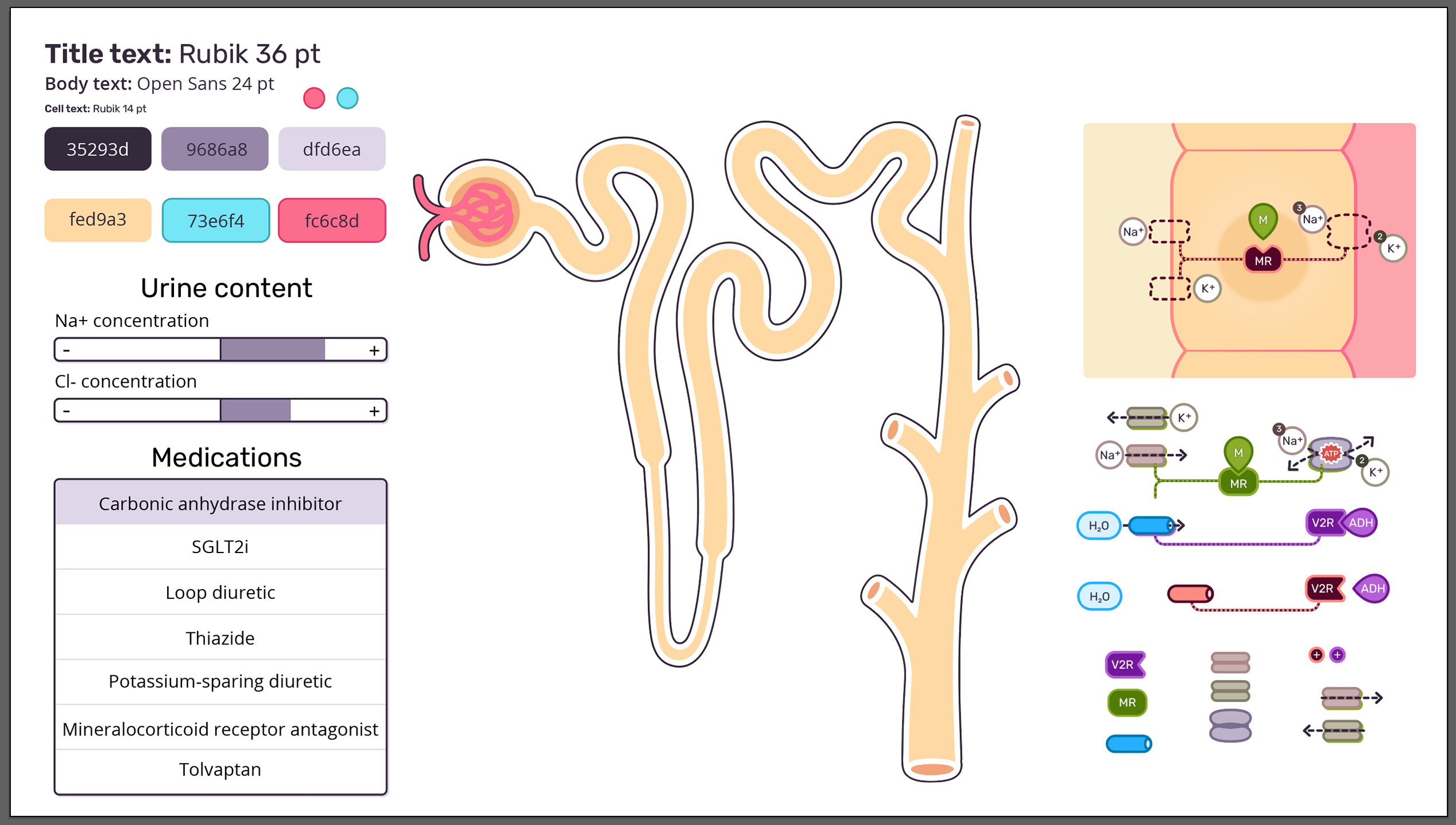 • This interactive was created for use by medical students studying the effects of different diuretic drugs on the nephron. Style guide and asset development by me; wireframes and interactive design by Carolyn Chen; interactive development in Unity by Alexandria Dannhardt. For a detailed breakdown of the project development process, see Alex’s post about it!